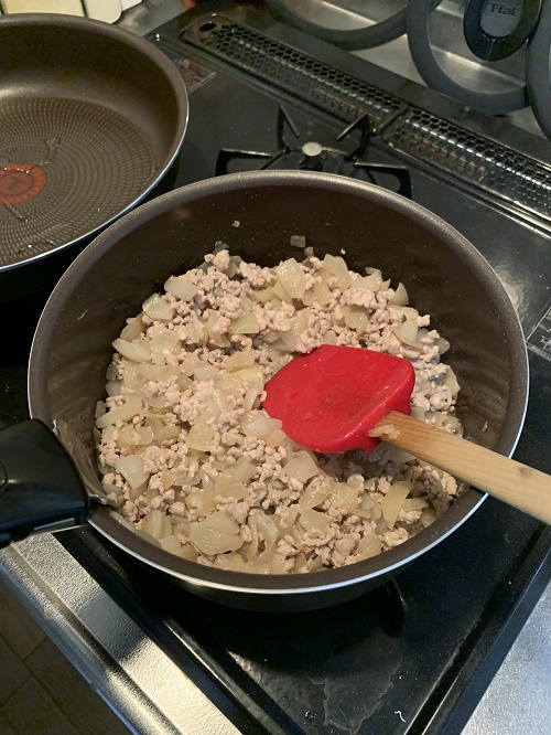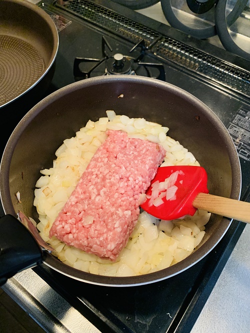 玉ねぎを炒めたら、豚ひき肉を加えて火が通るまで炒めます。